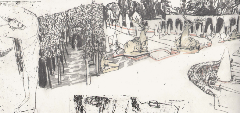 Zeichnerische und druckgraphische Arbeiten einer Reise zum Schwetzinger Schlossgarten im Juni 2025