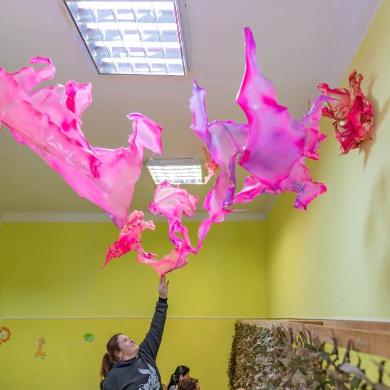 Projekt des Künstlers in einem Heim für autistische Mädchen in Odessa, in dem die charakteristischen pinken, biomorphen Objekte einen außergewöhnlichen, bizarren Akzent in den eher tristen Gebäuden und den von Kriegserfahrungen geprägten Alltag setzen.